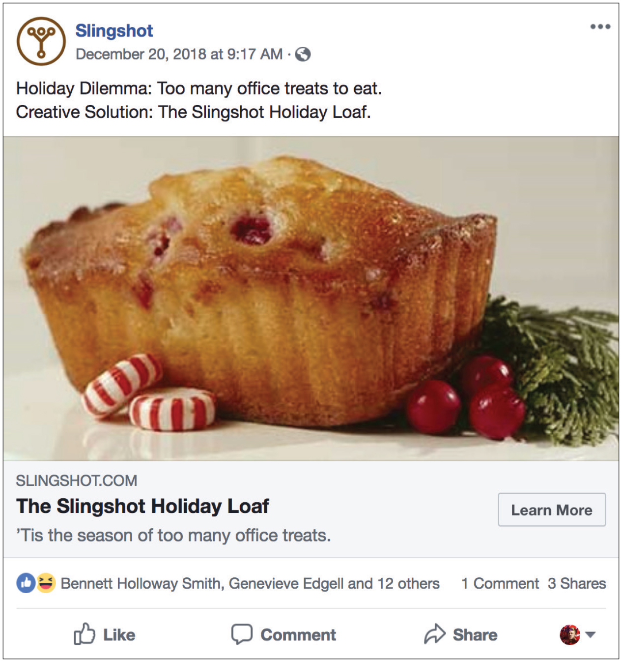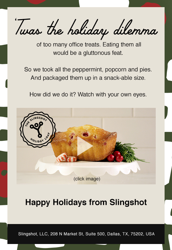 Enter: The Slingshot Holiday Loaf. We gathered all the usual, tempestuous suspects: whole pies, cartons of eggnog, tins of popcorn –you name it– and we baked them into a delicious mini loaf. We were thrilled to conquer the battle and give our friends and clients the freedom to indulge in all their favorite treats, just on a much smaller, guilt-free scale.