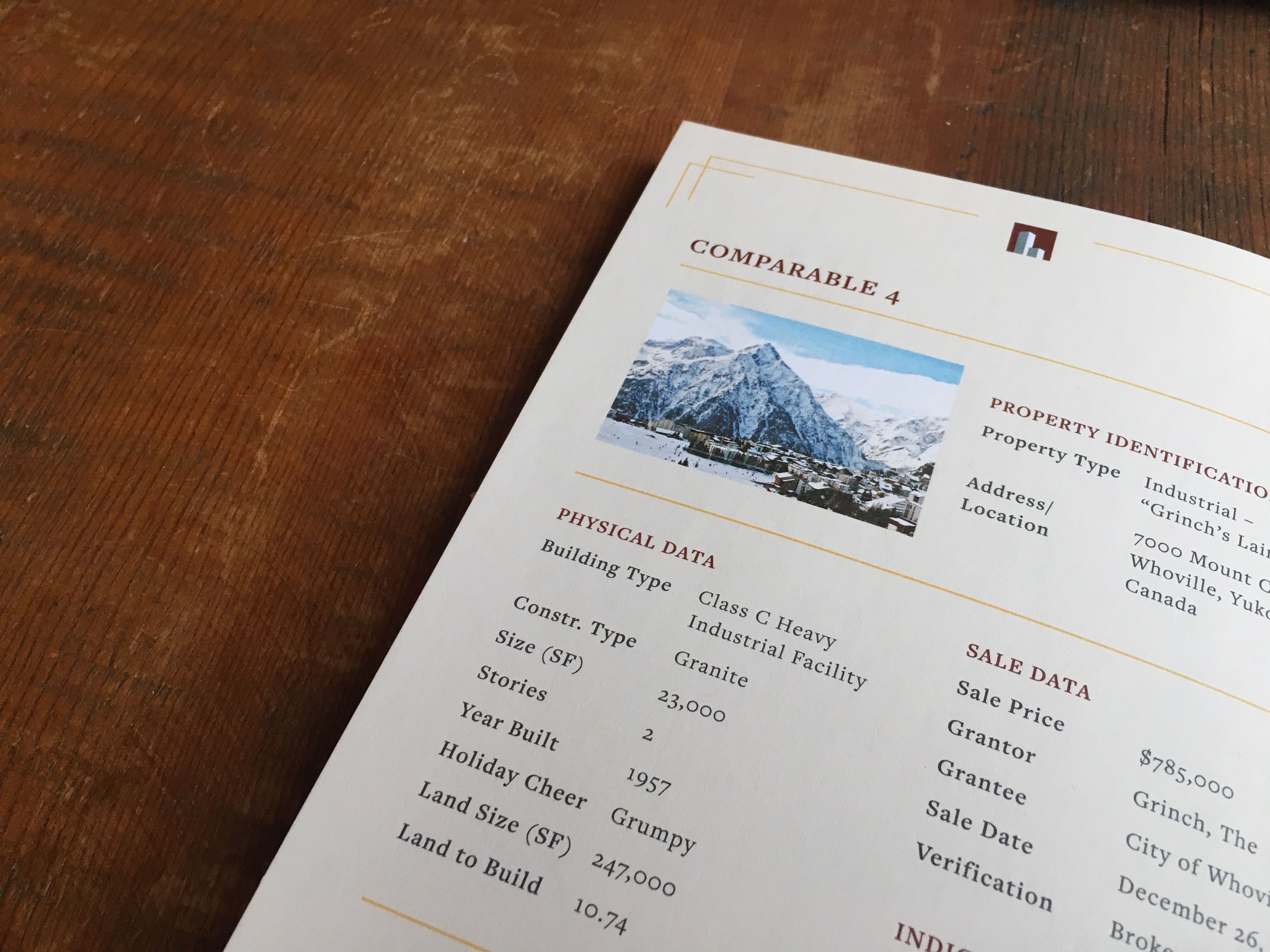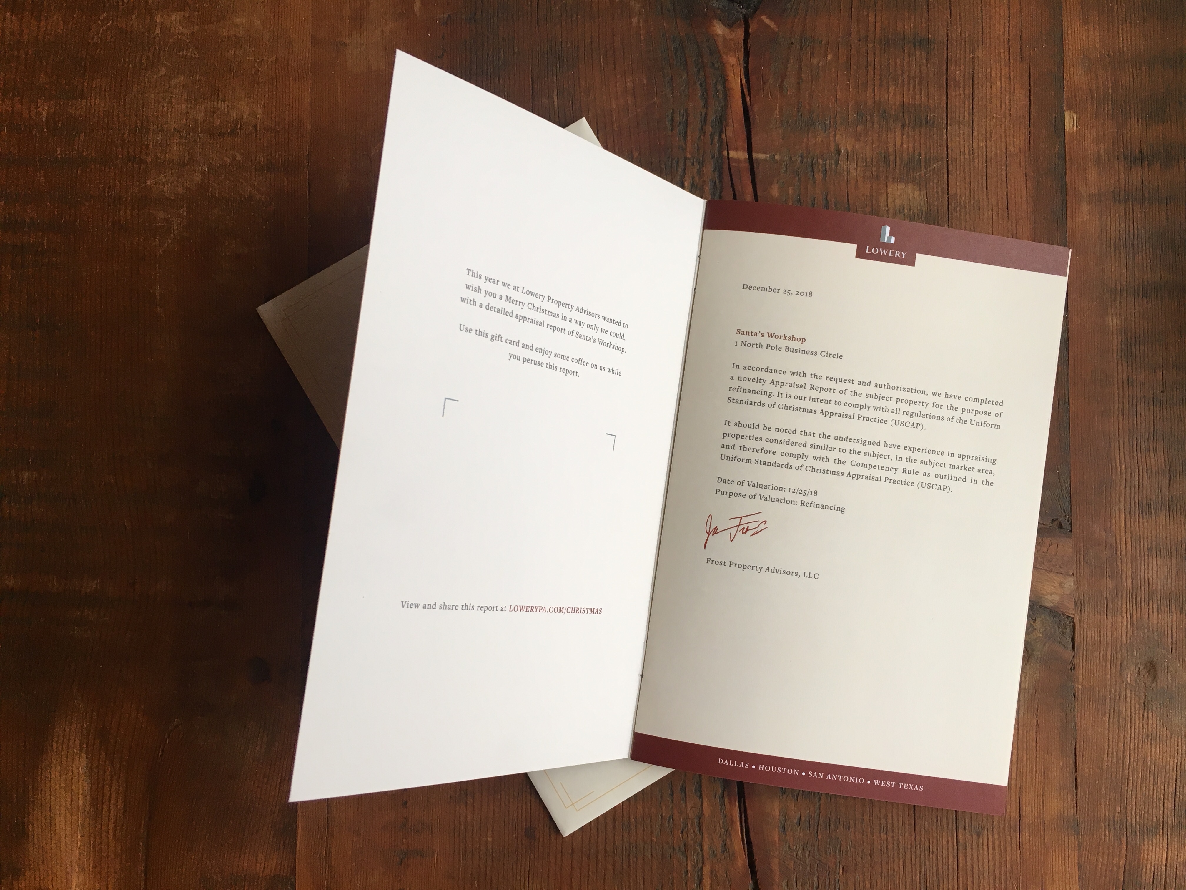 LPA specializes in delivering commercial real estate appraisals for properties of all kinds. Seriously–you name it, they’ll appraise it. So, for LPA’s 2018 holiday card Slingshot came up with the idea to do a comical appraisal of Santa’s workshop. The clever, in-depth analysis of the big guy’s stomping grounds was a pretty big hit with LPA’s customers.